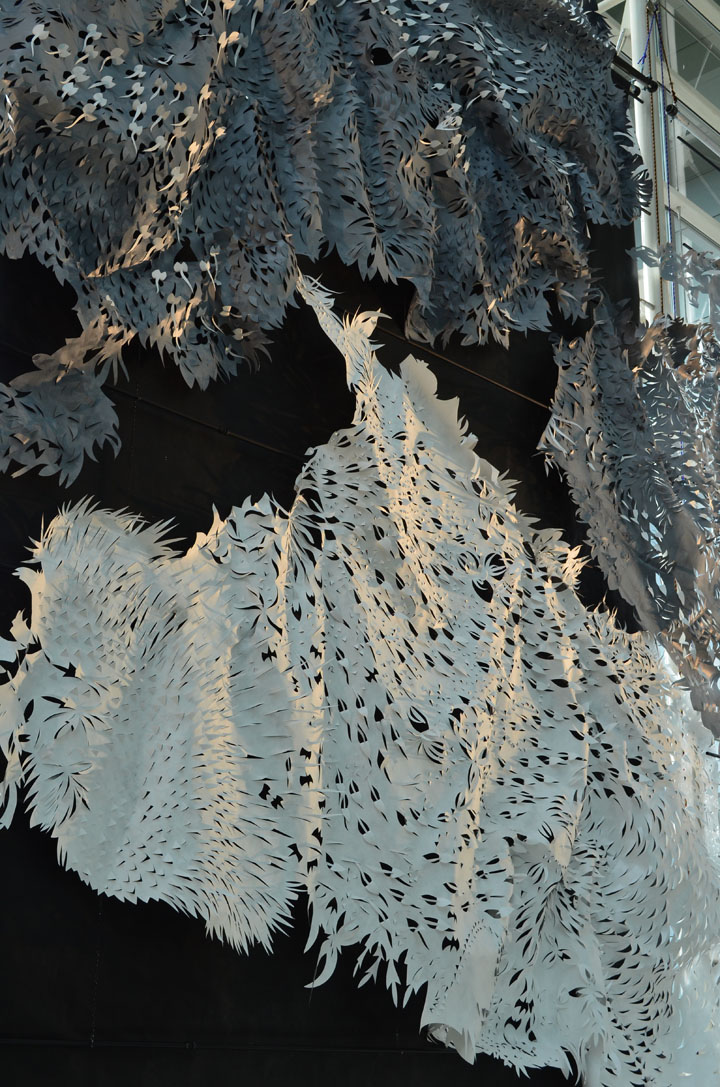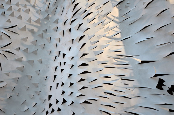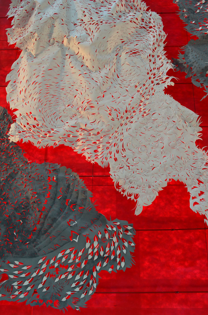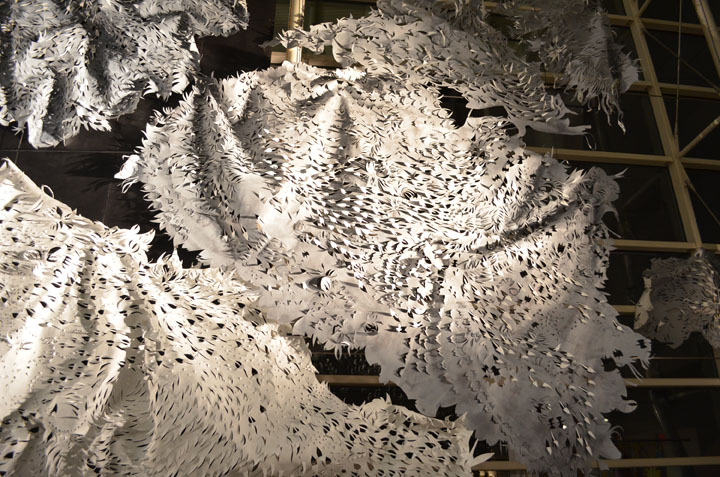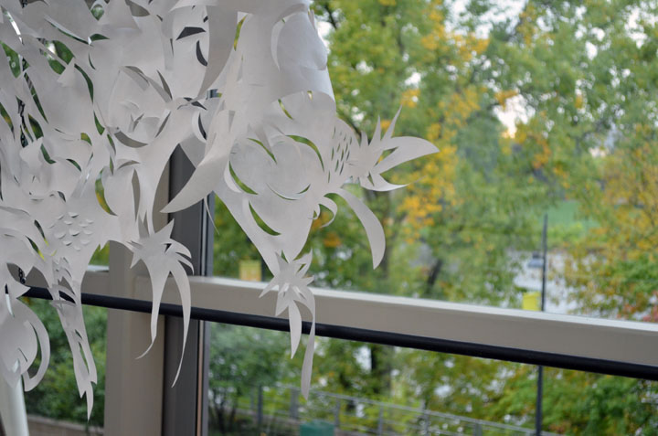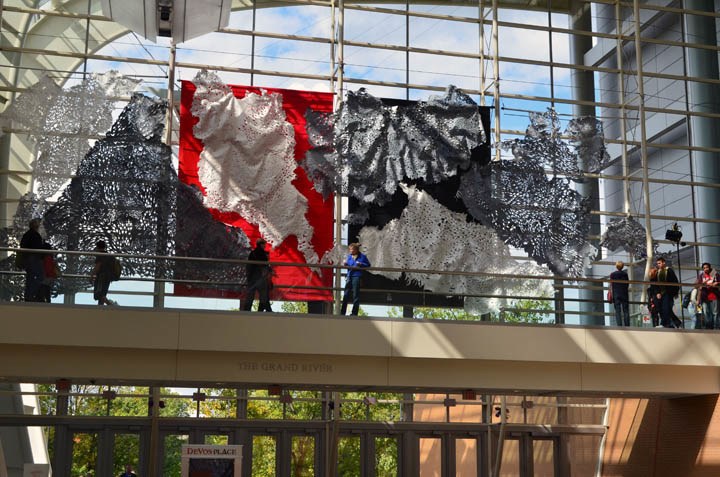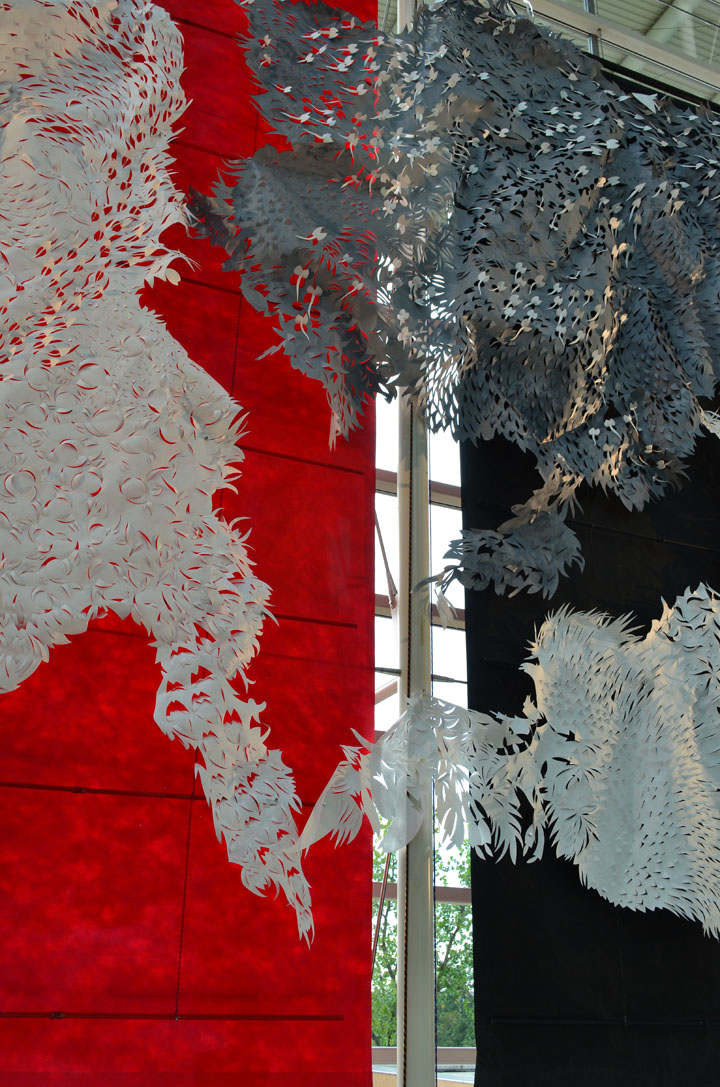 Redux means "to re-imagine". Cut entirely from Tyvek paper, "Paperika Redux" asks the viewer to re-imagine paper in the 21st century. Simultaneously precious, and disposable, paper has been the archival repository of our storytelling, culture and history of the world - a job currently being relegated to digital devices. We now look at paper in new ways. The work also asks us to re-imagine the natural world as we confront climate change, species extinction and genetic modification. Paperika Redux provides a re-imagined organic nature displayed against the background of the natural world beyond the windows in the exhibition center. Two primal cutting styles are used with several variations to combine, flow, morph and multiply, creating complexity from simplicity. By positioning the paper on both the inside and outside of the glass, we bridge the gap, allowing nature to come inside and freeing the art to overlay on the natural world. The piece is informed by traditional paper cutting techniques from many cultures around the world. Artprize is an international art event offering some of the world's largest cash prizes for an art competition. Over 1500 artists participated in 2011, exhibiting their work in over 150 venues in Grand Rapids, Michigan. For more information on Artprize, please go to www.artprize.org |