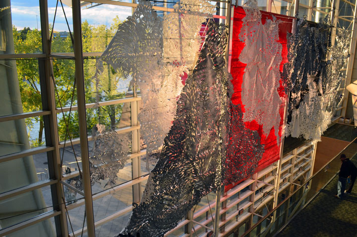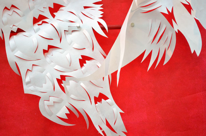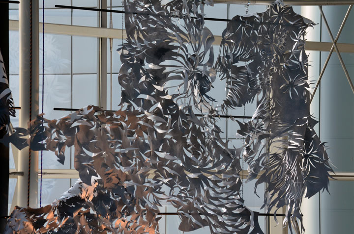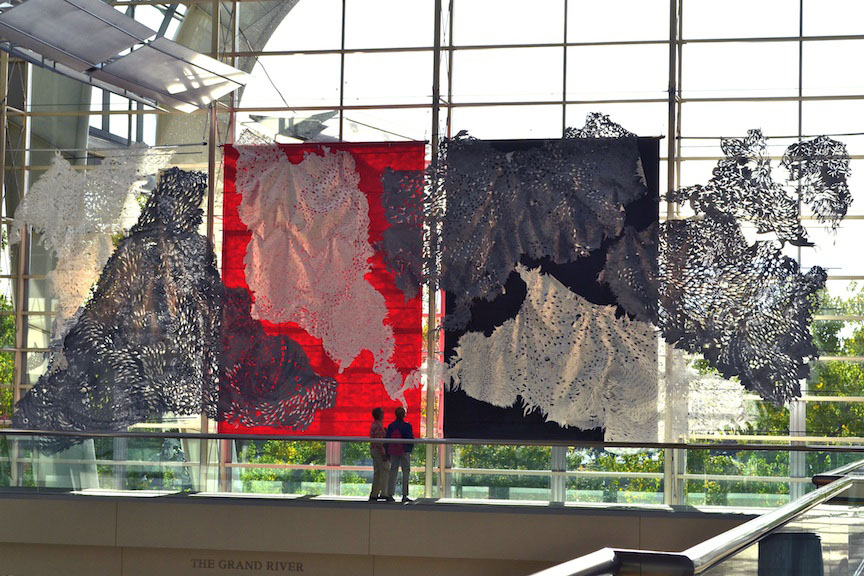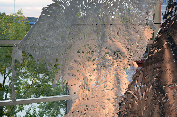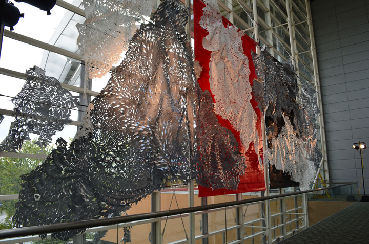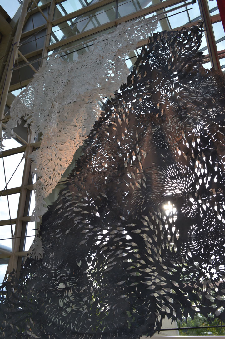 Redux means "to re-imagine". Cut entirely from Tyvek paper, "Paperika Redux" asks the viewer to re-imagine paper in the 21st century. Simultaneously precious, and disposable, paper has been the archival repository of our storytelling, culture and history of the world - a job currently being relegated to digital devices. We now look at paper in new ways. The work also asks us to re-imagine the natural world as we confront climate change, species extinction and genetic modification. Paperika Redux provides a re-imagined organic nature displayed against the background of the natural world beyond the windows in the exhibition center. Two primal cutting styles are used with several variations to combine, flow, morph and multiply, creating complexity from simplicity. By positioning the paper on both the inside and outside of the glass, we bridge the gap, allowing nature to come inside and freeing the art to overlay on the natural world. The piece is informed by traditional paper cutting techniques from many cultures around the world. Artprize is an international art event offering some of the world's largest cash prizes for an art competition. Over 1500 artists participated in 2011, exhibiting their work in over 150 venues in Grand Rapids, Michigan. For more information on Artprize, please go to www.artprize.org |