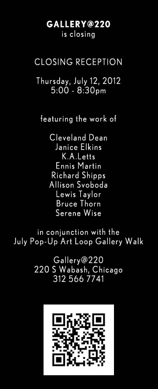 last one night stand Thursday, July 12 was the final closing reception for Gallery@220. We had a one-day, one-evening exhibition by nine of the artists who showed their work in Gallery@220 over the last two years. Exhibiting artists were Cleveland Dean, Janice Elkins, K.A.Letts, Ennis Martin, Richard Shipps, Allison Svoboda, Lewis Taylor, Bruce Thorn and Serene Wise. |