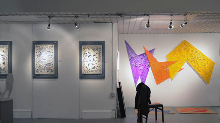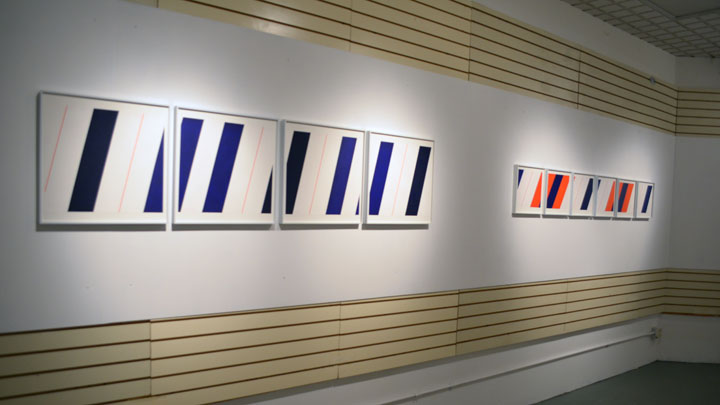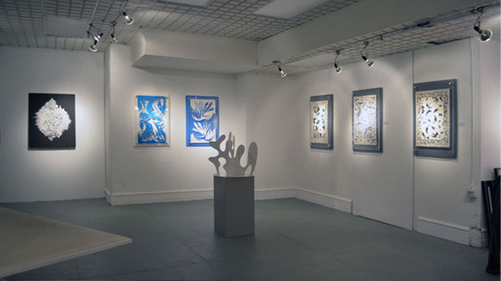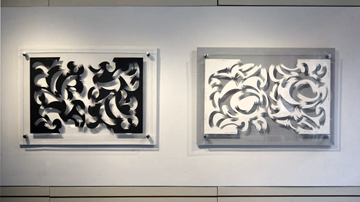 E!X!HiBiTiON! presents three artists, featuring the new abstract expressionist paintings of Janice Elkins, the minimalist work of Serene Wise and the abstract cut paper art of Richard Shipps. Janice Elkins' work has a special energy and spontaneity combined with a defining thoughtfulness. She immerses herself in the work and becomes the vehicle (consciously and unconsciously) for expressing personal and universal images. She presents a group of recent paintings in a limited palette of blacks and grays and another group in vibrant color. The work of Serene Wise is influenced by a long line of minimalist practitioners from Josef Albers to Daniel Buren to Ian Davenport. Her paintings are line studies — studies in the linear geometry of visual rhythms. The paintings are designed in series and each series becomes a self- generating exploration of a defined visual rhythm. These pieces are an Homage to French minimalist Daniel Buren. Richard Shipps brings more offerings from his rapidly evolving vocabulary of cut paper works, focusing on a collection of obscure shapes to tell larger stories in explorations of form. His imagery is revealed within the spaces, shadows and shapes we rarely see, but look at every day. |