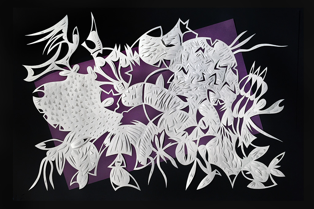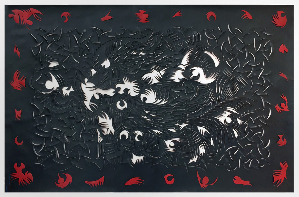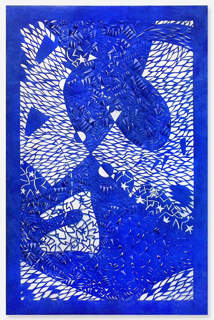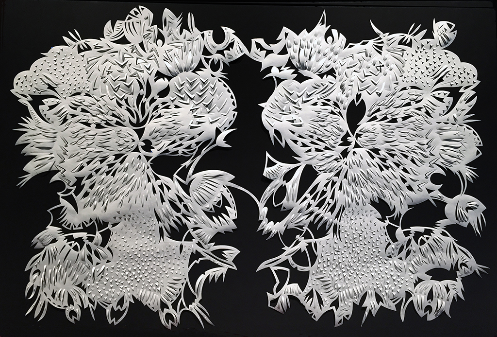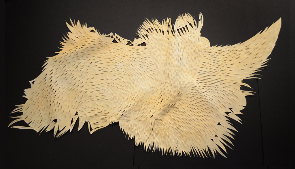 Wildlife, Tyvek paper & acrylic paint, 60"h x 40"w (framed), 2015