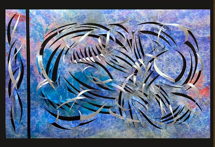 Crossed Streams 2, Tyvek paper, acrylic paint, 39"h x 75"w, 2012