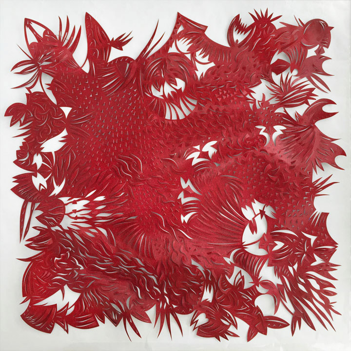 "Red Organic Whim Number Two", Tyvek paper & acrylic paint, 34"h x 34"w, 2015